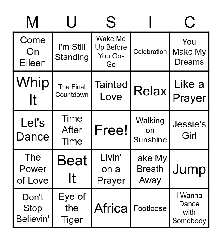 This bingo card has a free space and 45 words: Girls Just Want to Have Fun, I Wanna Dance with Somebody, Billie Jean, Don't Stop Believin', Take On Me, Footloose, Wake Me Up Before You Go-Go, Sweet Child O' Mine, You Make My Dreams, Eye of the Tiger, Celebration, Walking on Sunshine, Livin' on a Prayer, Beat It, Summer of '69, Africa, Love Shack, Let's Dance, You Shook Me All Night Long, Like a Prayer, I'm Still Standing, Karma Chameleon, Everybody Wants to Rule the World, Come On Eileen, Thriller, Jessie's Girl, Hungry Like the Wolf, Girls on Film, Take My Breath Away, The Power of Love, With or Without You, Jump, Pour Some Sugar on Me, Faith, Another One Bites the Dust, Time After Time, Total Eclipse of the Heart, Push It, Don't You (Forget About Me), Tainted Love, Whip It, Relax, Addicted to Love, The Final Countdown and Walking on Broken Glass.