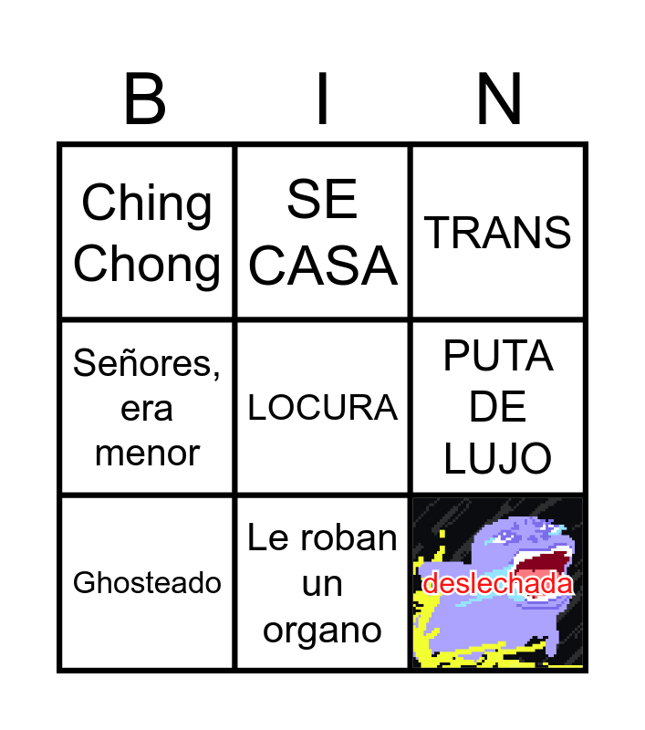 This bingo card has 1 images, a free space and 8 words: PUTA DE LUJO, TRANS, SE CASA, Ghosteado, Ching Chong, deslechada, Señores, era menor and Le roban un organo.