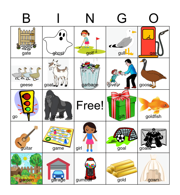 This bingo card has 24 images, a free space and 24 words: game, garage, garbage, garden, gas, gate, geese, ghost, gift, girl, give, go, goal, goalie, goat, gold, goldfish, golf, goose, gorilla, gown, guitar, gull and gumball.