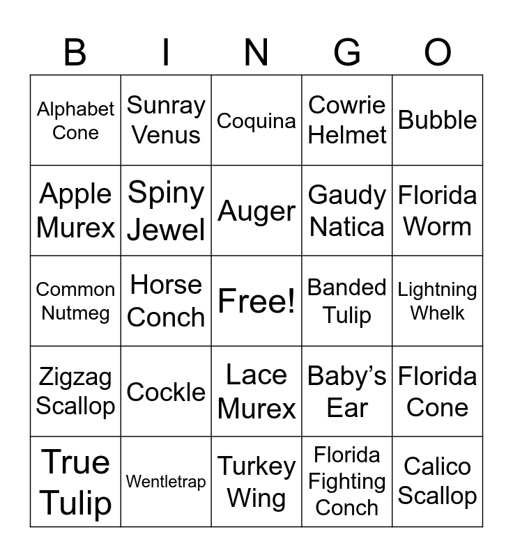 This bingo card has a free space and 29 words: True Tulip, Angel Wing, Horse Conch, Shark’s Eye, Alphabet Cone, Coquina, Spiny Jewel, Cockle, Banded Tulip, Wentletrap, Lightning Whelk, Calico Scallop, Turkey Wing, Florida Fighting Conch, Florida Worm, Lettered Olive, Lace Murex, Zigzag Scallop, Bubble, Common Nutmeg, Baby’s Ear, Common Fig, Gaudy Natica, Apple Murex, Cowrie Helmet, Sunray Venus, Florida Cone, Auger and Cerith.