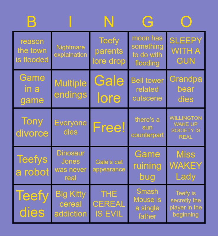 This bingo card has a free space and 24 words: Teefy dies, Dinosaur Jones was never real, Gale lore, Smash Mouse is a single father, SLEEPY WITH A GUN, reason the town is flooded, Nightmare explaination, Teefy parents lore drop, there’s a sun counterpart, WILLINGTON WAKE UP SOCIETY IS REAL, Tony divorce, Multiple endings, Game ruining bug, Miss WAKEY Lady, Game in a game, Big Kitty cereal addiction, THE CEREAL IS EVIL, moon has something to do with flooding, Grandpa bear dies, Teefys a robot, Everyone dies, Gale’s cat appearance, Bell tower related cutscene and Teefy is secretly the player in the beginning.