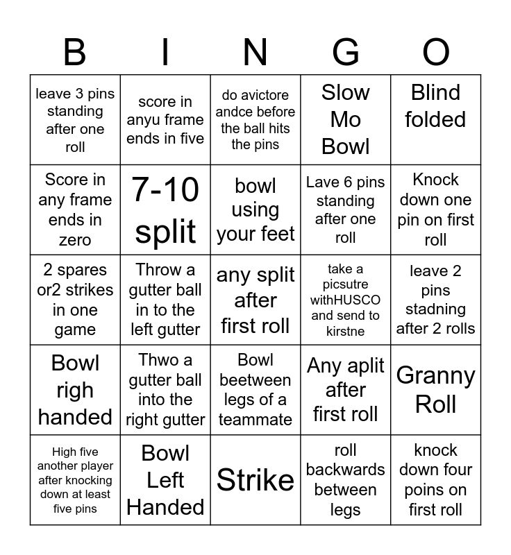 This bingo card has 47 words: Leave 7 Pins standing after one roll, Bowl Left Handed, Leave 4 pins Standing after two rols, Spare, Knock down one pin on first roll, Bowl righ handed, score in anyu frame ends in five, Double Gutter frame, Lave 6 pins standing after one roll, knock down four poins on first roll, Score in any frame ends in zero, 7-10 split, roll backwards between legs, Granny Roll, Leave 5 pins standing after two rolls, bowl with mask on, bowl using your feet, Any aplit after first roll, total sover over 40 points, leave 3 pins standing after one roll, Thwo a gutter ball into the right gutter, Strike, Slow Mo Bowl, Blind folded, Just bolw Leave four pins standing after one rollFree!, Throw a gutter ball in to the left gutter, Bowl beetween legs of a teammate, knock down nine pins on first toll, leave 2 pins stadning after 2 rolls, 2 spares or2 strikes in one game, spin 2 times before you bolw, roll backwards between legs, leave three pins stnaind after one roll, totoal score over 50, Score in a frame that ends in zero, 7-10 split, any split after first roll, any split after two rolls, double gutter, High five another player after knocking down at least five pins, Call your shot and if you make it, mark a second square off, do avictore andce before the ball hits the pins, take a picsutre withHUSCO and send to kirstne, bowl laing on stomach or stiing, give a scuab hand signal and you can't bowl until someone retruss the signal to you, do your bowl approach, but do a 3 second safety stop before you relaze the ball and Bowl with ball that is NOT black..