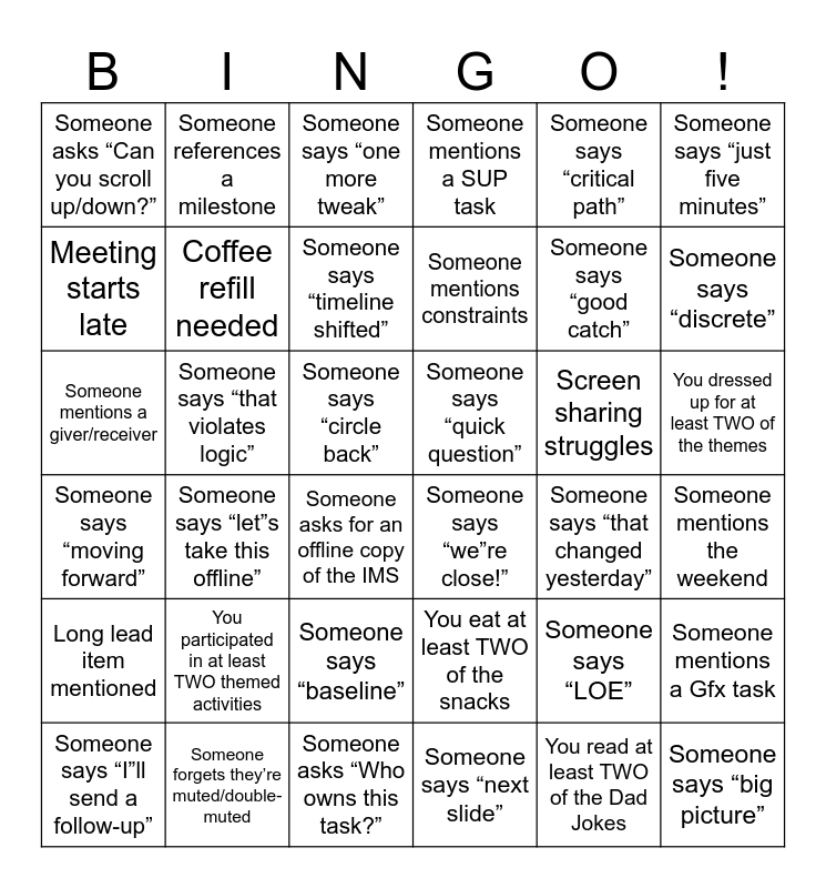 This bingo card has 36 words: You eat at least TWO of the snacks, Someone says “baseline”, Someone says “next slide”, Meeting starts late, Someone says “moving forward”, Someone says “quick question”, Coffee refill needed, Someone asks “Who owns this task?”, Someone says “critical path”, Someone says “LOE”, Someone says “discrete”, Someone mentions a SUP task, Someone mentions a Gfx task, Someone says “that violates logic”, Someone mentions constraints, Someone asks “Can you scroll up/down?”, Long lead item mentioned, Screen sharing struggles, Someone mentions a giver/receiver, Someone says “one more tweak”, Someone says “circle back”, Someone says “let”s take this offline”, Someone says “we”re close!”, Someone asks for an offline copy of the IMS, Someone says “that changed yesterday”, Someone references a milestone, Someone says “good catch”, Someone forgets they’re muted/double-muted, Someone says “timeline shifted”, Someone says “just five minutes”, Someone says “big picture”, Someone says “I”ll send a follow-up”, Someone mentions the weekend, You dressed up for at least TWO of the themes, You participated in at least TWO themed activities and You read at least TWO of the Dad Jokes.