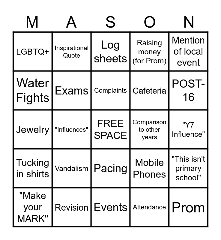 This bingo card has a free space and 34 words: Uniform, Attendance, Bunking, Toilets, Tucking in shirts, Exams, Mention of local event, "Make your MARK", Inspirational Quote, Rolling of Dresses, Complaints, Log sheets, Detentions, Number of Misdemeanours, Comparison to other years, POST-16, Revision, Jewelry, Vandalism, Mobile Phones, Pacing, Mention of clubs, LGBTQ+, "Y7 Influence", Events, Prom, Raising money (for Prom), Expulisions, Cafeteria, Water Fights, Food Fights, "Influences", "This isn't primary school" and "Respect everyone".