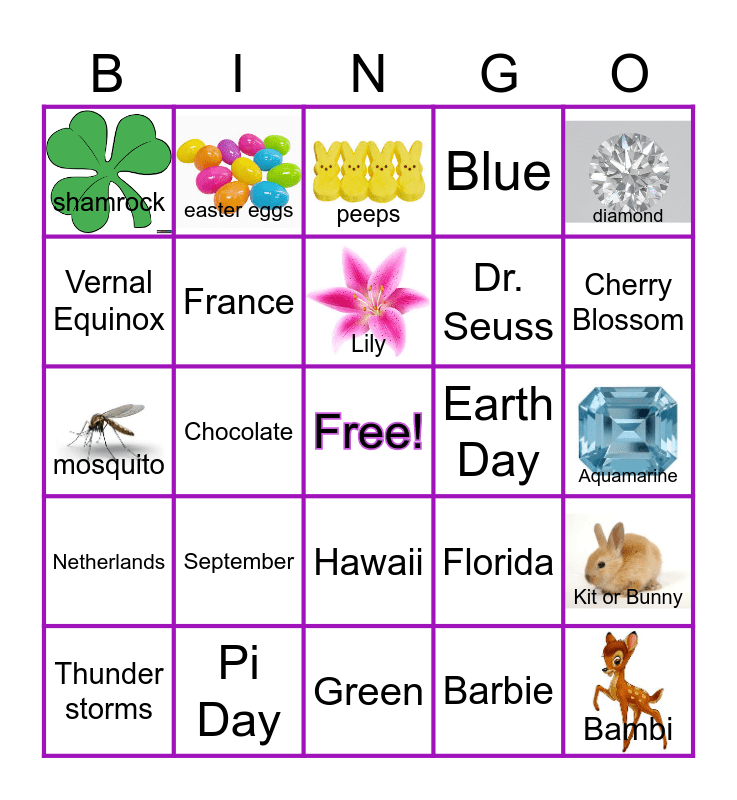 This bingo card has 9 images, a free space and 24 words: September, Pi Day, Lily, Thunder storms, diamond, shamrock, Vernal Equinox, easter eggs, Earth Day, Hawaii, Dr. Seuss, mosquito, Florida, Kit or Bunny, France, Barbie, Aquamarine, peeps, Cherry Blossom, Chocolate, Bambi, Netherlands, Blue and Green.
