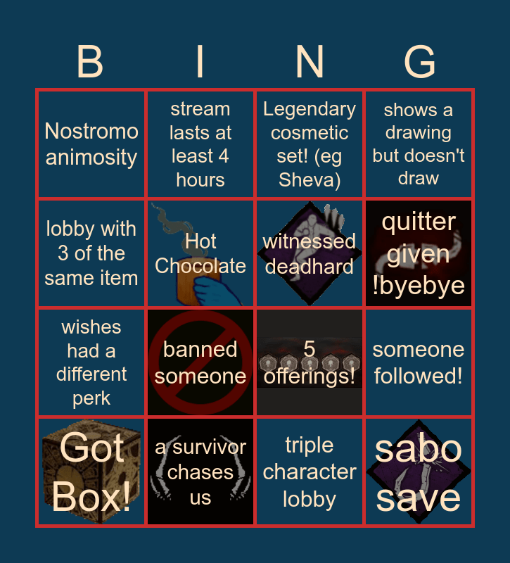 This bingo card has 23 images and 48 words: 2+ gg in endgame chat, Got Box!, a 1v1 happened!, "one more game", shoutout!, Swamp animosity, stream lasts at least 4 hours, was slugged, Hot Chocolate, whispering, witnessed deadhard, shows a drawing but doesn't draw, saw a mori happen!, drink water together, caught swearing with !swearjar, we do a little play-by-play, quitter given !byebye, a survivor chases us, flashbang ineffective, lobby with 3 of the same item, someone followed!, mentions temperature, Nostromo animosity, wishes had a different perk, got the sneezes, banned someone, mic bump, Another Yoichi!, flashbang save!, sabo save, skips a song or starts a song over, saw or got ds'd, saw a determined camper, Pinned quest, draws during stream, brb screen, Panic noises, triple character lobby, saw a last-second character swap, Tapp or Haddie or Alan or Jeff or Ash, Saw a mori, pinned a message, Legendary cosmetic set! (eg Sheva), party streamers anniversary cake, 5 offerings!, triple band shirt, everyone readied up! and hidden offering.