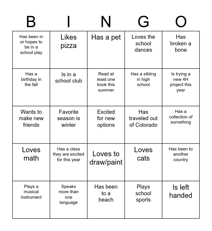 This bingo card has 25 words: Loves math, Speaks more than one language, Excited for new options, Plays school sports, Has broken a bone, Has been in or hopes to be in a school play, Likes pizza, Has a pet, Has traveled out of Colorado, Has been to another country, Has a birthday in the fall, Is in a school club, Has been to a beach, Loves cats, Is trying a new 4H project this year, Plays a musical instrument, Favorite season is winter, Read at least one book this summer, Has a sibling in high school, Has a collection of something, Wants to make new friends, Has a class they are excited for this year, Loves to draw/paint, Loves the school dances and Is left handed.