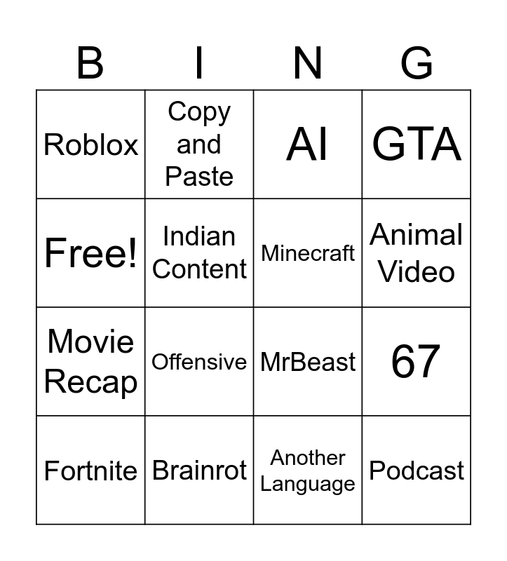 This bingo card has 16 words: Brainrot, 67, AI, Roblox, Movie Recap, Copy and Paste, MrBeast, Another Language, Free!, Indian Content, Fortnite, GTA, Offensive, Animal Video, Minecraft and Podcast.