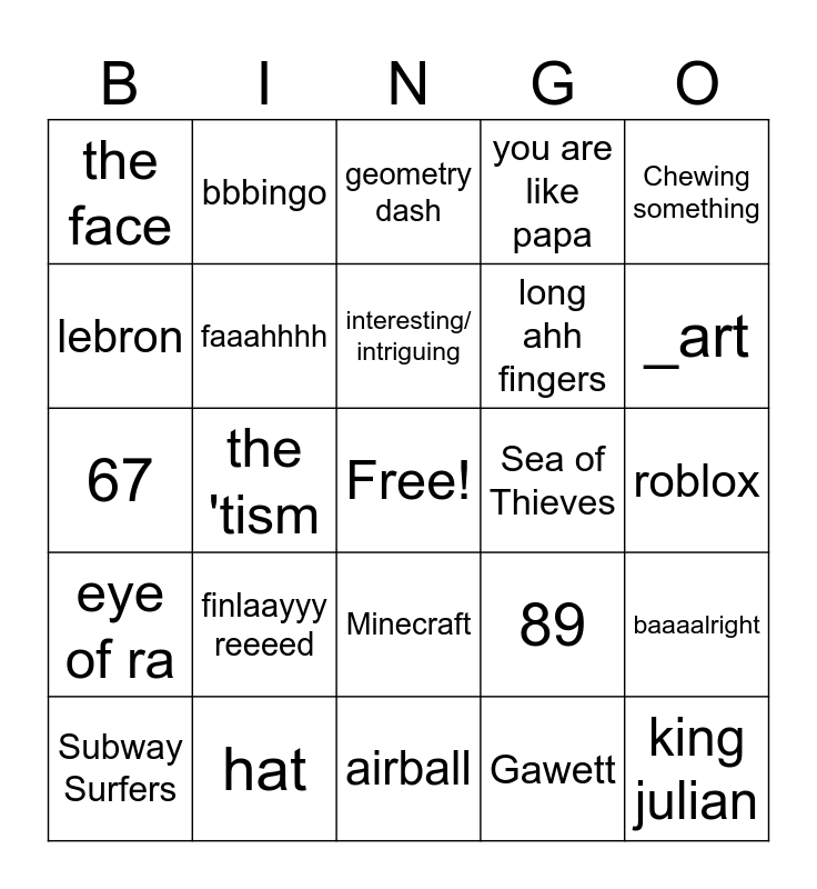 This bingo card has a free space and 24 words: finlaayyy reeeed, hat, interesting/ intriguing, Subway Surfers, Chewing something, the face, lebron, bbbingo, Sea of Thieves, Minecraft, long ahh fingers, 67, 89, baaaalright, faaahhhh, Gawett, roblox, geometry dash, _art, the 'tism, king julian, eye of ra, you are like papa and airball.