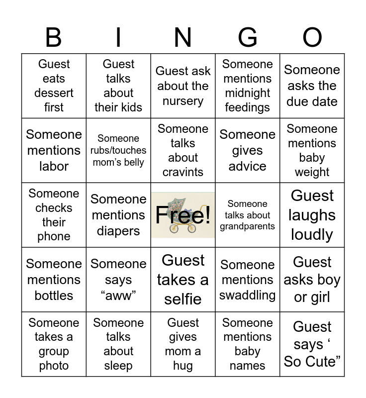 This bingo card has a free space and 24 words: Someone says “aww”, Someone talks about sleep, Someone talks about cravints, Someone takes a group photo, Someone asks the due date, Guest eats dessert first, Someone mentions labor, Guest talks about their kids, Someone talks about grandparents, Guest takes a selfie, Someone gives advice, Someone checks their phone, Someone mentions swaddling, Guest asks boy or girl, Someone rubs/touches mom’s belly, Someone mentions baby names, Guest laughs loudly, Guest ask about the nursery, Someone mentions baby weight, Someone mentions diapers, Guest says ‘ So Cute”, Someone mentions bottles, Someone mentions midnight feedings and Guest gives mom a hug.