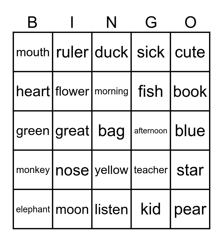 This bingo card has a free space and 24 words: nose, moon, morning, elephant, cute, mouth, heart, ruler, afternoon, yellow, fish, green, teacher, star, flower, kid, blue, duck, book, great, pear, monkey, sick and listen.