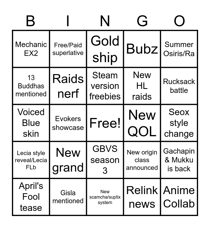 This bingo card has a free space and 24 words: April's Fool tease, New grand, Steam version freebies, Relink news, Summer Osiris/Ra, Mechanic EX2, Free/Paid superlative, Gold ship, New QOL, Seox style change, Voiced Blue skin, Raids nerf, New origin class announced, Gachapin & Mukku is back, 13 Buddhas mentioned, Gisla mentioned, New scamcha/suptix system, Bubz, Rucksack battle, Lecia style reveal/Lecia FLb, Evokers showcase, GBVS season 3, New HL raids and Anime Collab.