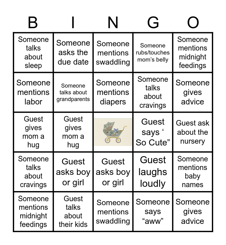 This bingo card has a free space and 50 words: Guest takes a selfie, Someone gives advice, Someone checks their phone, Someone mentions swaddling, Guest asks boy or girl, Guest says “bundle of joy”, Someone asks the due date, Guest eats dessert first, Someone mentions labor, Guest talks about their kids, Someone talks about grandparents, Someone rubs/touches mom’s belly, Someone mentions baby names, Guest laughs loudly, Guest ask about the nursery, Someone mentions baby weight, Someone mentions diapers, Guest says ‘ So Cute”, Someone mentions bottles, Someone mentions midnight feedings, Guest gives mom a hug, Someone says “aww”, Someone talks about sleep, Someone talks about cravings, Someone takes a group photo, Guest takes a selfie, Someone gives advice, Someone checks their phone, Someone mentions swaddling, Guest asks boy or girl, Guest says “bundle of joy”, Someone asks the due date, Guest eats dessert first, Someone mentions labor, Guest talks about their kids, Someone talks about grandparents, Someone rubs/touches mom’s belly, Someone mentions baby names, Guest laughs loudly, Guest ask about the nursery, Someone mentions baby weight, Someone mentions diapers, Guest says ‘ So Cute”, Someone mentions bottles, Someone mentions midnight feedings, Guest gives mom a hug, Someone says “aww”, Someone talks about sleep, Someone talks about cravings and Someone takes a group photo.