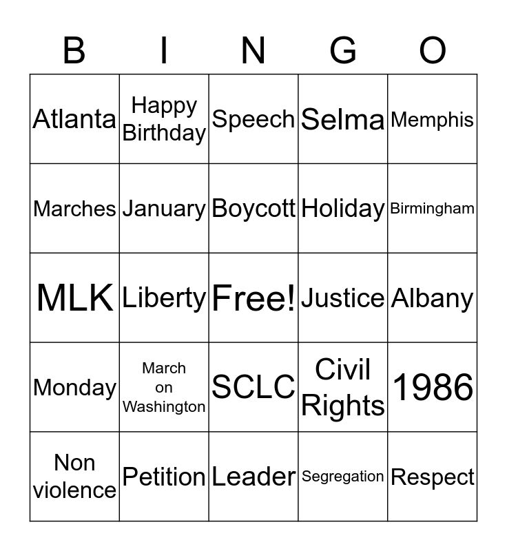 This bingo card has a free space and 24 words: March on Washington, Petition, Boycott, Non violence, Memphis, Atlanta, Marches, Happy Birthday, Justice, SCLC, Holiday, MLK, Civil Rights, 1986, January, Segregation, Albany, Speech, Birmingham, Liberty, Respect, Monday, Selma and Leader.