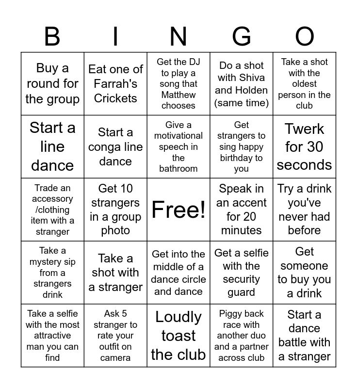 This bingo card has a free space and 24 words: Take a shot with a stranger, Ask 5 stranger to rate your outfit on camera, Give a motivational speech in the bathroom, Take a selfie with the most attractive man you can find, Take a shot with the oldest person in the club, Buy a round for the group, Start a line dance, Eat one of Farrah's Crickets, Speak in an accent for 20 minutes, Get into the middle of a dance circle and dance, Get strangers to sing happy birthday to you, Trade an accessory /clothing item with a stranger, Get a selfie with the security guard, Get someone to buy you a drink, Start a conga line dance, Piggy back race with another duo and a partner across club, Try a drink you've never had before, Get the DJ to play a song that Matthew chooses, Twerk for 30 seconds, Get 10 strangers in a group photo, Start a dance battle with a stranger, Take a mystery sip from a strangers drink, Do a shot with Shiva and Holden (same time) and Loudly toast the club.