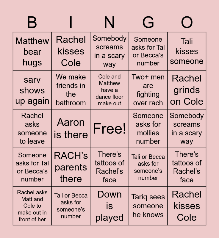 This bingo card has a free space and 43 words: Rachel grinds on Cole, Rachel kisses Cole, Rachel tells Cole he’s so hot, Rachel asks Matt and Cole to make out in front of her, Matthew bear hugs, Tariq sees someone he knows, Somebody screams in a scary way, Becca kisses someone, Tali kisses someone, Tali or Becca asks for someone’s number, Someone asks for Tal or Becca’s number, Someone asks for mollies number, There’s tattoos of Rachel’s face, RACH’s parents there, Aaron is there, Down is played, Becca nip slips, Rachel asks someone to leave, Cole and Matthew have a dance floor make out, Rachel grinds on Cole, Rachel kisses Cole, Rachel tells Cole he’s so hot, Rachel asks Matt and Cole to make out in front of her, Matthew bear hugs, Tariq sees someone he knows, Somebody screams in a scary way, Becca kisses someone, Tali kisses someone, Tali or Becca asks for someone’s number, Someone asks for Tal or Becca’s number, Someone asks for mollies number, There’s tattoos of Rachel’s face, RACH’s parents there, Aaron is there, Down is played, Becca nip slips, Rachel asks someone to leave, Cole and Matthew have a dance floor make out, sarv shows up again, Two+ men are fighting over rach, Photo op on the stairs, We make friends in the bathroom and Someone falls down the stairs.