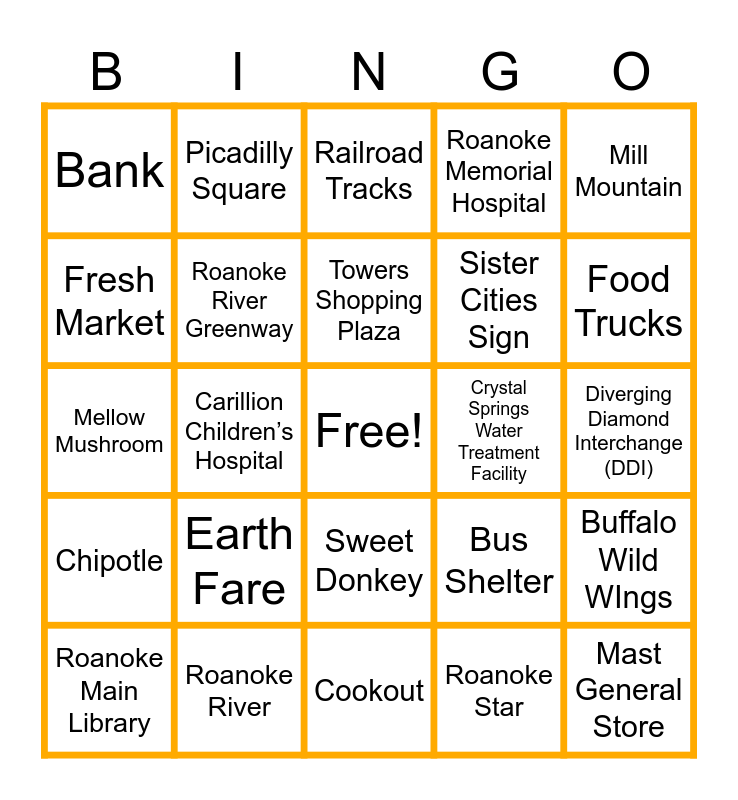 This bingo card has a free space and 44 words: Roanoke City Municipal Building, Mast General Store, Elmwood Park, Roanoke Main Library, The Train Station Venue, Roanoke Star, Railroad Tracks, River’s Edge Park, Mill Mountain, Roanoke River, Roanoke Memorial Hospital, Crystal Springs Water Treatment Facility, Sweet Donkey, Earth Fare, Roanoke Animal Hospital, Cookout, Barrel Chest, Mellow Mushroom, Walgreens, Food Trucks, Picadilly Square, Townside Festival Shopping Plaza, Montanos, Bank, Colony House Motor Lodge, Diverging Diamond Interchange (DDI), Tanglewood Mall, YMCA, Bus Shelter, Chipotle, Chili’s, Buffalo Wild WIngs, TJ Maxx / HomeGoods, AMC Movie Theater, Carillion Children’s Hospital, Barnes and Noble, Virginia Western Community College, Community Arboretum, Towers Shopping Plaza, Fresh Market, Sister Cities Sign, Interstate 581, Roanoke River Greenway and River’s Edge Park.