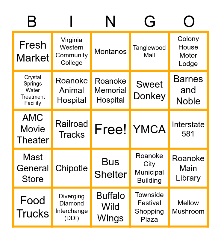 This bingo card has a free space and 44 words: Barrel Chest, Mellow Mushroom, Walgreens, Food Trucks, Picadilly Square, Townside Festival Shopping Plaza, Montanos, Bank, Colony House Motor Lodge, Diverging Diamond Interchange (DDI), Tanglewood Mall, YMCA, Bus Shelter, Chipotle, Chili’s, Buffalo Wild WIngs, TJ Maxx / HomeGoods, AMC Movie Theater, Carillion Children’s Hospital, Barnes and Noble, Virginia Western Community College, Community Arboretum, Towers Shopping Plaza, Fresh Market, Sister Cities Sign, Interstate 581, Roanoke River Greenway, River’s Edge Park, Roanoke City Municipal Building, Mast General Store, Elmwood Park, Roanoke Main Library, The Train Station Venue, Roanoke Star, Railroad Tracks, River’s Edge Park, Mill Mountain, Roanoke River, Roanoke Memorial Hospital, Crystal Springs Water Treatment Facility, Sweet Donkey, Earth Fare, Roanoke Animal Hospital and Cookout.