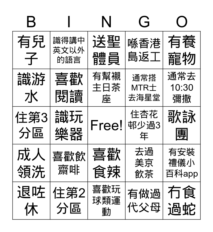 This bingo card has a free space and 25 words: 退咗休, 喜歡飲 齋啡, 有幫襯 主日茶 座, 有做過代父母, 通常去 10:30 彌撒, 有兒子, 識得講中英文以外的語言, 送聖體員, 通常搭MTR士去海星堂, 有安裝禮儀小百科app, 住第3分區, 喜歡閱讀, 去過 美京 飲茶, 冇食 過蛇, 識游 水, 著緊 短袖衫, 喜歡玩球類運動, 喺香港島返工, 歌詠團, 成人領洗, 識玩樂器, 喜歡食辣, 住杏花邨少過3年, 有養寵物 and 住第2分區.