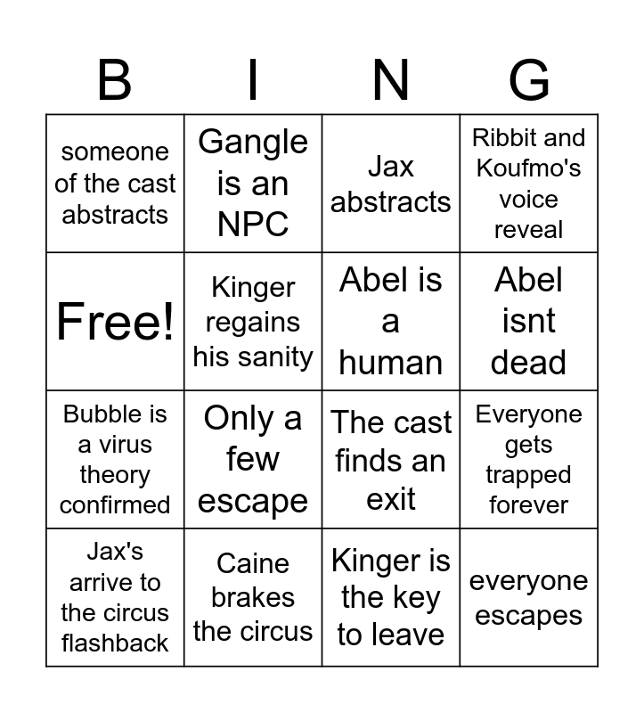 This bingo card has 16 words: Caine brakes the circus, Everyone gets trapped forever, Jax abstracts, someone of the cast abstracts, Bubble is a virus theory confirmed, Gangle is an NPC, The cast finds an exit, Kinger is the key to leave, Free!, Kinger regains his sanity, Jax's arrive to the circus flashback, Ribbit and Koufmo's voice reveal, Only a few escape, Abel isnt dead, Abel is a human and everyone escapes.
