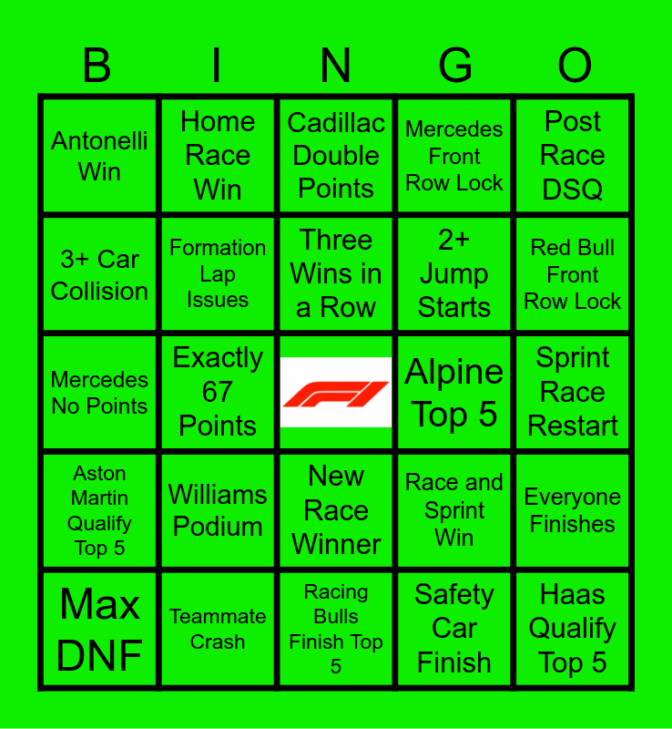This bingo card has a free space and 24 words: Williams Podium, Teammate Crash, Three Wins in a Row, Max DNF, Post Race DSQ, Antonelli Win, 3+ Car Collision, Home Race Win, Alpine Top 5, New Race Winner, 2+ Jump Starts, Mercedes No Points, Race and Sprint Win, Everyone Finishes, Formation Lap Issues, Safety Car Finish, Sprint Race Restart, Cadillac Double Points, Red Bull Front Row Lock, Exactly 67 Points, Haas Qualify Top 5, Aston Martin Qualify Top 5, Mercedes Front Row Lock and Racing Bulls Finish Top 5.