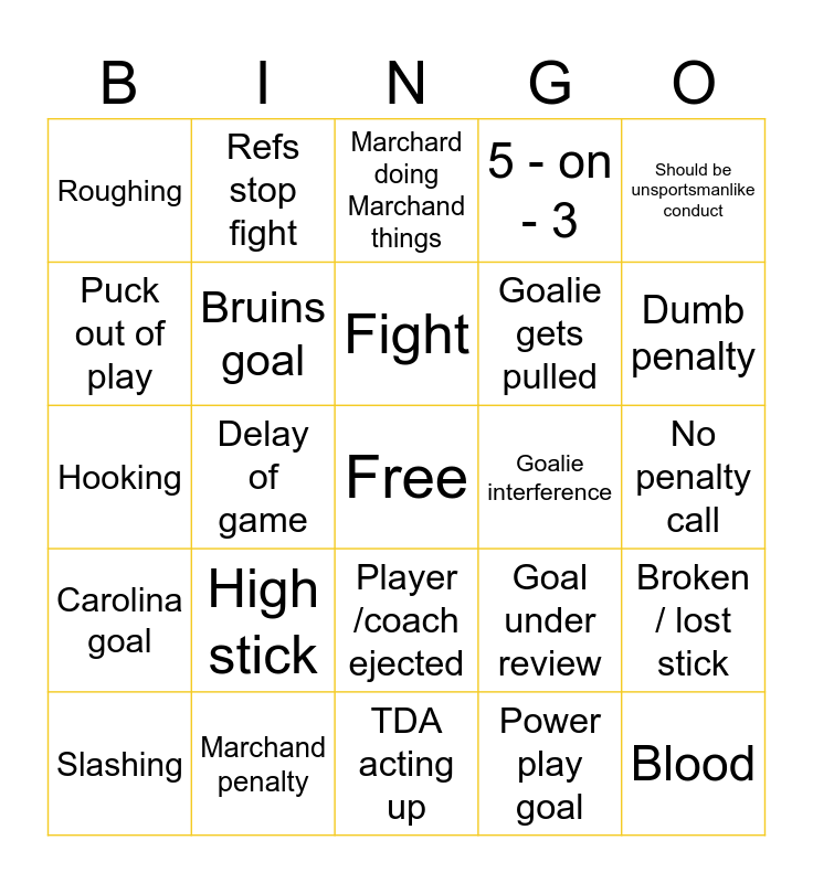 This bingo card has a free space and 27 words: Goal under review, Penalty kill, Goalie gets pulled, TDA acting up, Puck out of play, Marchard doing Marchand things, Refs stop fight, Carolina goal, Goalie interference, Broken / lost stick, Hooking, 5 - on - 3, Slashing, Marchand penalty, Dumb penalty, Too many men, Bruins goal, Fight, High stick, Roughing, No penalty call, Power play goal, Delay of game, Blood, Player /coach ejected, Should be unsportsmanlike conduct and Coach yelling.