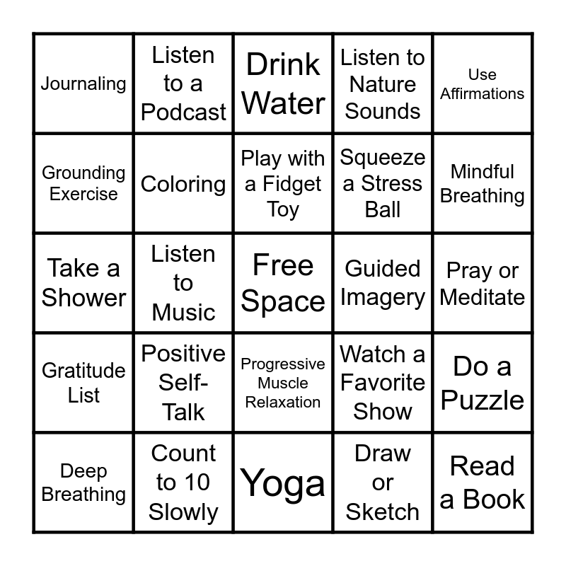 This bingo card has a free space and 29 words: Deep Breathing, Take a Walk, Listen to Music, Talk to Someone, Journaling, Drink Water, Coloring, Positive Self-Talk, Guided Imagery, Count to 10 Slowly, Pray or Meditate, Read a Book, Yoga, Draw or Sketch, Mindful Breathing, Stretching, Progressive Muscle Relaxation, Gratitude List, Use Affirmations, Take a Shower, Watch a Favorite Show, Ask for Help, Squeeze a Stress Ball, Grounding Exercise, Listen to Nature Sounds, Listen to a Podcast, Do a Puzzle, Play with a Fidget Toy and Write Positive Thoughts.