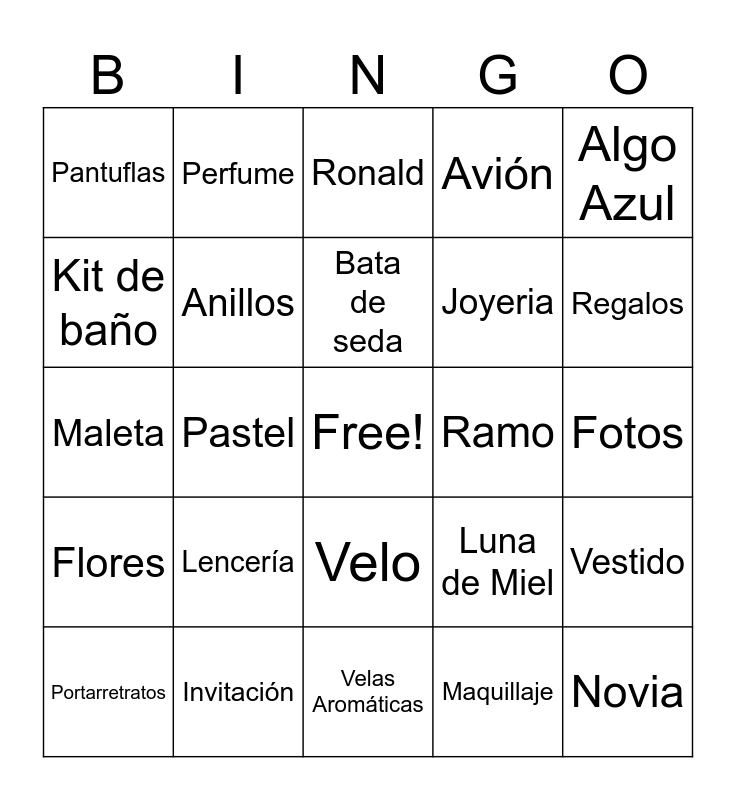 This bingo card has a free space and 25 words: Lencería, Velas Aromáticas, Bata de seda, Portarretratos, Algo Azul, Pantuflas, Kit de baño, Perfume, Ramo, Velo, Joyeria, Maleta, Luna de Miel, Vestido, Anillos, Votos, Fotos, Ronald, Regalos, Pastel, Novia, Invitación, Flores, Avión and Maquillaje.