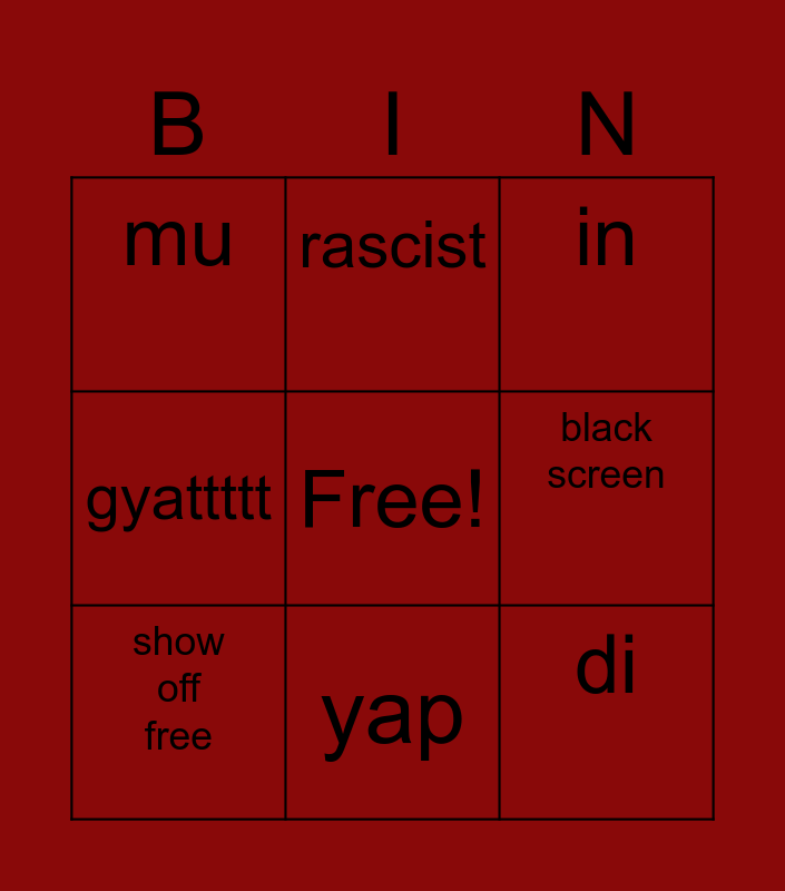 This bingo card has a free space and 8 words: black screen, in, rascist, show off free, mu, di, gyattttt and yap.