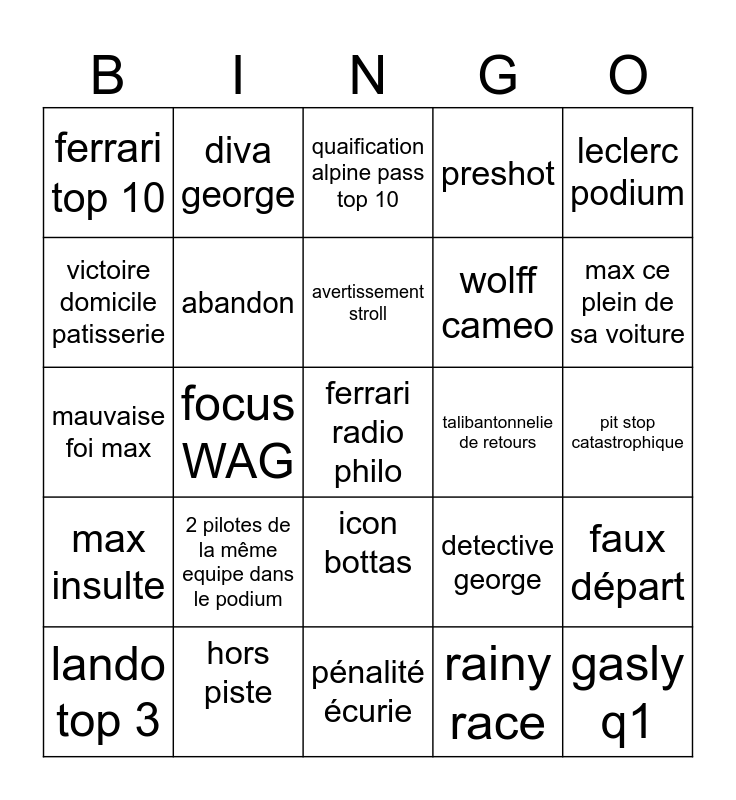 This bingo card has a free space and 24 words: 2 pilotes de la même equipe dans le podium, hors piste, avertissement stroll, lando top 3, leclerc podium, ferrari top 10, victoire domicile patisserie, diva george, talibantonnelie de retours, icon bottas, wolff cameo, mauvaise foi max, detective george, faux départ, abandon, rainy race, pit stop catastrophique, quaification alpine pass top 10, max ce plein de sa voiture, focus WAG, gasly q1, max insulte, preshot and pénalité écurie.