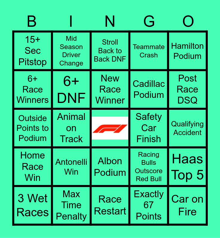 This bingo card has a free space and 24 words: Antonelli Win, Max Time Penalty, New Race Winner, 3 Wet Races, Hamilton Podium, 15+ Sec Pitstop, 6+ Race Winners, Mid Season Driver Change, Safety Car Finish, Albon Podium, Cadillac Podium, Outside Points to Podium, Racing Bulls Outscore Red Bull, Haas Top 5, 6+ DNF, Exactly 67 Points, Qualifying Accident, Stroll Back to Back DNF, Post Race DSQ, Animal on Track, Car on Fire, Home Race Win, Teammate Crash and Race Restart.