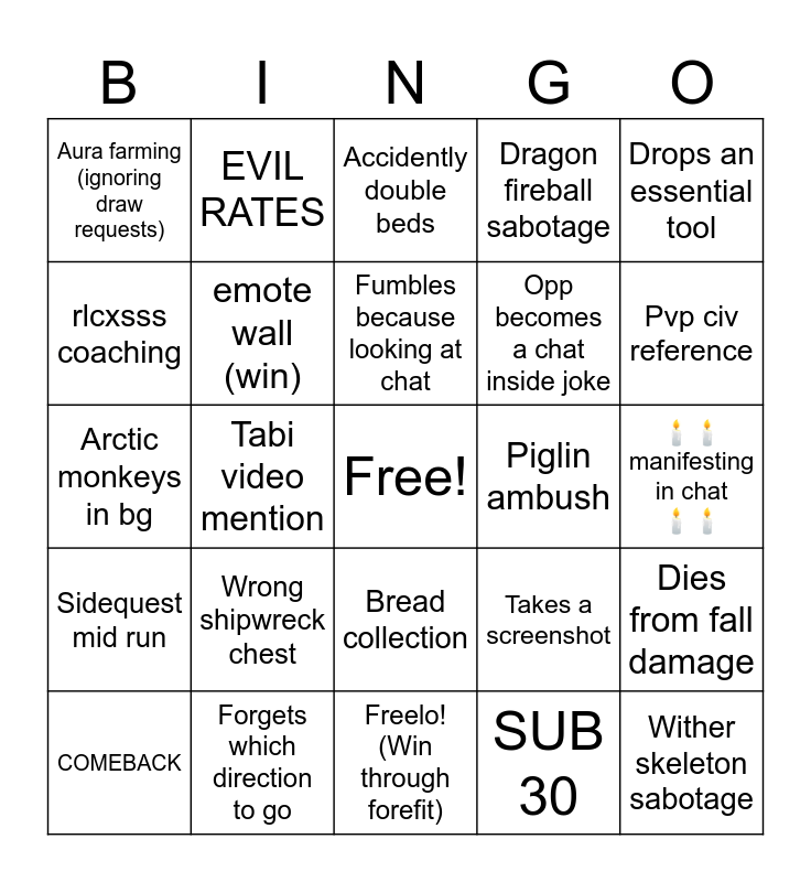 This bingo card has a free space and 24 words: Wrong shipwreck chest, Forgets which direction to go, Fumbles because looking at chat, COMEBACK, Drops an essential tool, Aura farming (ignoring draw requests), rlcxsss coaching, EVIL RATES, Piglin ambush, Bread collection, Opp becomes a chat inside joke, Arctic monkeys in bg, Takes a screenshot, Dies from fall damage, emote wall (win), SUB 30, 🕯️🕯️ manifesting in chat 🕯️🕯️, Accidently double beds, Pvp civ reference, Tabi video mention, Wither skeleton sabotage, Sidequest mid run, Dragon fireball sabotage and Freelo! (Win through forefit).