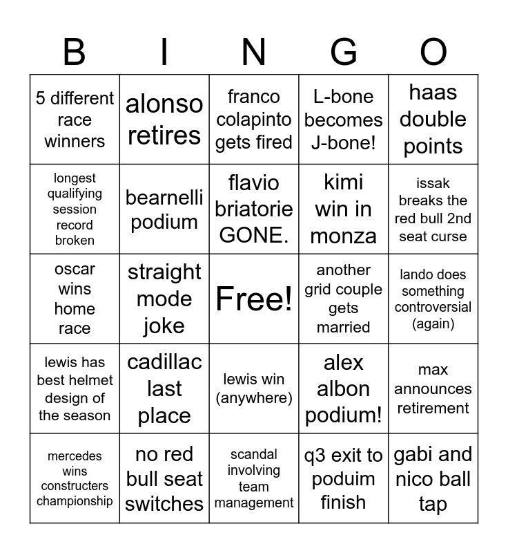 This bingo card has a free space and 24 words: cadillac last place, no red bull seat switches, flavio briatorie GONE., mercedes wins constructers championship, haas double points, 5 different race winners, longest qualifying session record broken, alonso retires, another grid couple gets married, lewis win (anywhere), kimi win in monza, oscar wins home race, alex albon podium!, max announces retirement, bearnelli podium, q3 exit to poduim finish, lando does something controversial (again), franco colapinto gets fired, issak breaks the red bull 2nd seat curse, straight mode joke, gabi and nico ball tap, lewis has best helmet design of the season, L-bone becomes J-bone! and scandal involving team management.