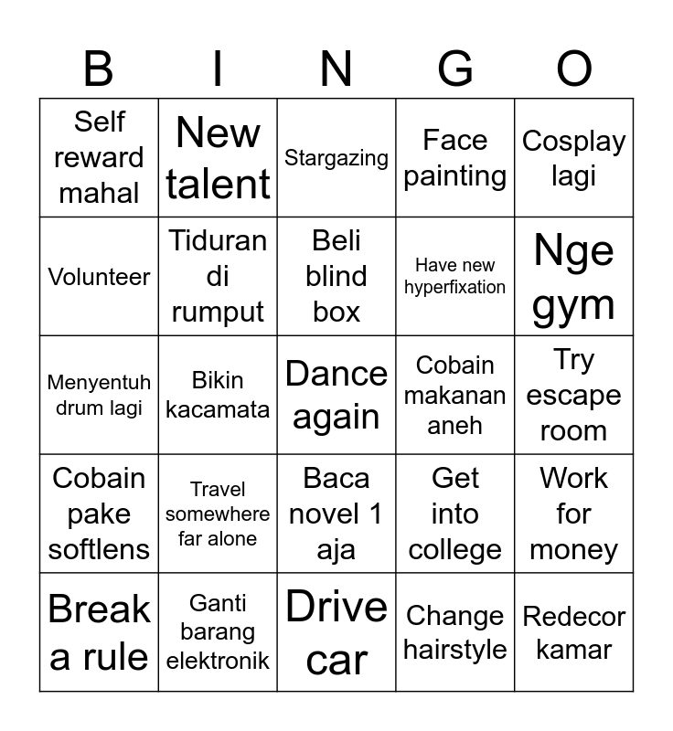 This bingo card has 25 words: Travel somewhere far alone, Drive car, Beli blind box, Break a rule, Cosplay lagi, Self reward mahal, Volunteer, New talent, Cobain makanan aneh, Baca novel 1 aja, Have new hyperfixation, Menyentuh drum lagi, Get into college, Work for money, Tiduran di rumput, Redecor kamar, Try escape room, Stargazing, Nge gym, Bikin kacamata, Dance again, Ganti barang elektronik, Cobain pake softlens, Face painting and Change hairstyle.