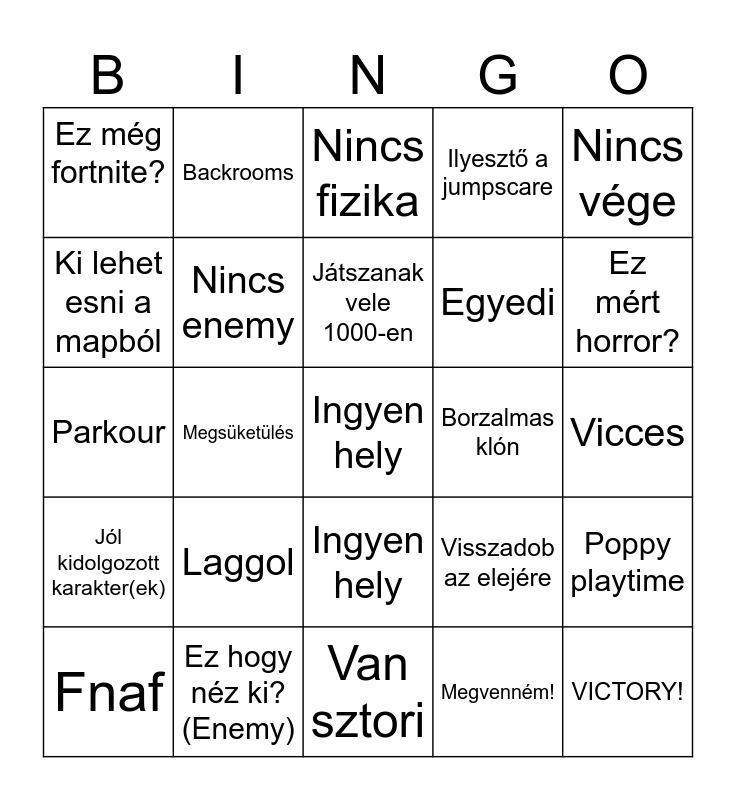 This bingo card has a free space and 24 words: Laggol, Ez hogy néz ki?(Enemy), Játszanak vele 1000-en, Fnaf, Nincs vége, Ez még fortnite?, Ki lehet esni a mapból, Backrooms, Borzalmas klón, Ingyen hely, Egyedi, Parkour, Visszadob az elejére, Poppy playtime, Nincs enemy, Megvenném!, Vicces, Nincs fizika, Ez mért horror?, Megsüketülés, VICTORY!, Jól kidolgozott karakter(ek), Ilyesztő a jumpscare and Van sztori.