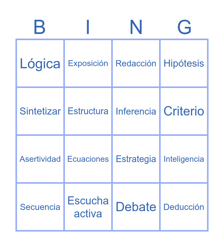 This bingo card has 24 words: Oratoria, Vocabulario, Criterio, Secuencia, Sintetizar, Lógica, Estructura, Exposición, Escucha activa, Debate, Asertividad, Estrategia, Matemáticas, Reflexión, Inferencia, Análisis, Debate, Redacción, Ecuaciones, Inteligencia, Secuencia, Deducción, Hipótesis and Patrón.