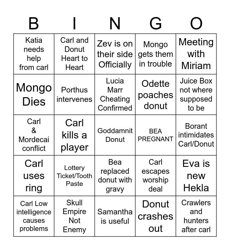 This bingo card has a free space and 24 words: Lottery Ticket/Tooth Paste, Skull Empire Not Enemy, Lucia Marr Cheating Confirmed, Carl Low intelligence causes problems, Meeting with Miriam, Katia needs help from carl, Mongo Dies, Carl and Donut Heart to Heart, BEA PREGNANT, Bea replaced donut with gravy, Odette poaches donut, Carl & Mordecai conflict, Carl escapes worship deal, Eva is new Hekla, Porthus intervenes, Donut crashes out, Borant intimidates Carl/Donut, Zev is on their side Officially, Juice Box not where supposed to be, Carl kills a player, Crawlers and hunters after carl, Carl uses ring, Mongo gets them in trouble and Samantha is useful.