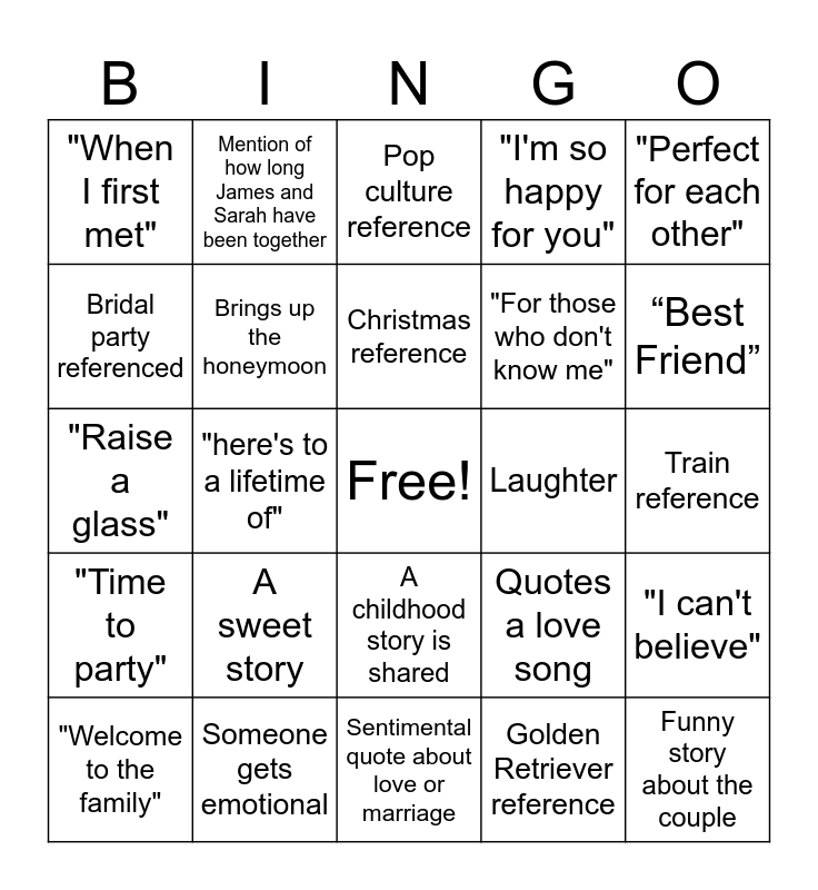 This bingo card has a free space and 55 words: Free space, "Welcome to the family", A kiss, "When I first met", Sentimental quote about love or marriage, "And finally", Brings up the honeymoon, "Looks amazing", "For those who don't know me", "Cheers", "I'm so happy for you", A shoutout, "Thank you for coming", "I'm going to keep this short", "I remember the time", "To the happy couple", "Perfect for each other", "here's to a lifetime of", "I can't believe", Funny story about the couple, Laughter, A toast to the parents of the couple, Quotes a love song, Pop culture reference, Taylor Swift reference, Christmas reference, Golden Retriever reference, Lego reference, Train reference, "I can't believe", "Ladies and gentlemen", "Happiness", "Would like to thank", "On a serious note", Bridal party referenced, "Raise a glass", "Gorgeous bride", "Time to party", "Finally", "We knew it was love", Mention of how long James and Sarah have been together, "true love", Mention of the weather, An embarrassing story, A sweet story, Someone gets emotional, A dad joke, A quote from a book or movie, “Lost without”, “Best Friend”, “In the end”, “I’m sure you’ll agree”, The speaker cries, A childhood story is shared and A guest laughs, cheers or shouts loudly.