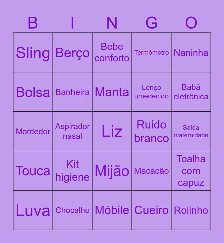 This bingo card has a free space and 34 words: Fralda, Cueiro, Chupeta, Mamadeira, Touca, Banheira, Naninha, Luva, Berço, Trocador, Manta, Bebe conforto, Pomada, Ninho, Ruido branco, Babá eletrônica, Chocalho, Mordedor, Kit higiene, Macacão, Mijão, Carrinho de bebê, Sling, Saída maternidade, Móbile, Rolinho, Termômetro, Body, Lenço umedecido, Bolsa, Álcool gel, Aspirador nasal, Toalha com capuz and Brinquedo.