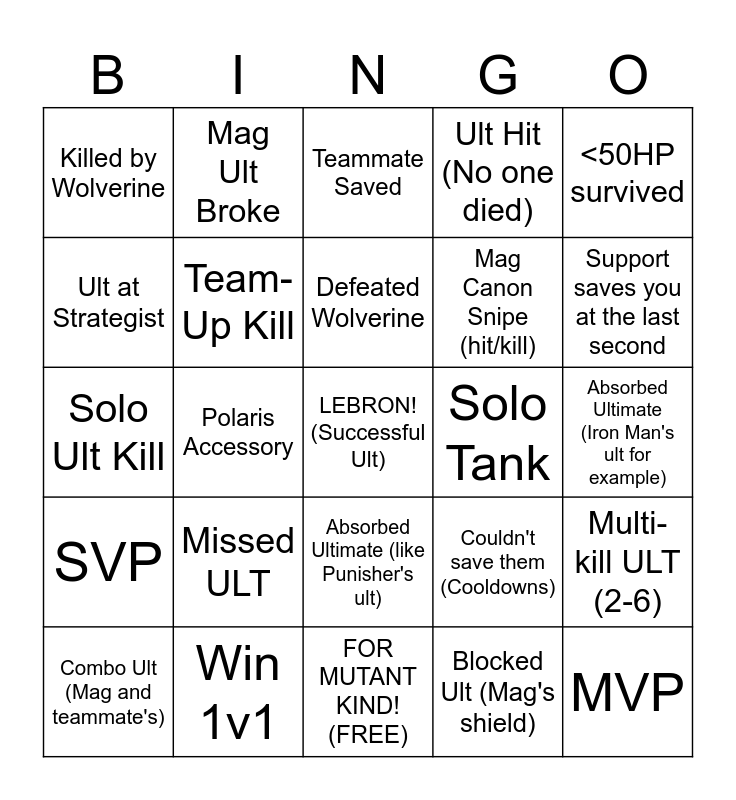This bingo card has 25 words: SVP, Win 1v1, LEBRON! (Successful Ult), Blocked Ult (Mag's shield), <50HP survived, Killed by Wolverine, Mag Ult Broke, Teammate Saved, Solo Tank, Multi-kill ULT (2-6), Ult at Strategist, Team-Up Kill, FOR MUTANT KIND! (FREE), Couldn't save them (Cooldowns), Support saves you at the last second, Combo Ult (Mag and teammate's), Polaris Accessory, Defeated Wolverine, Mag Canon Snipe (hit/kill), Absorbed Ultimate (Iron Man's ult for example), Solo Ult Kill, Missed ULT, Absorbed Ultimate (like Punisher's ult), Ult Hit (No one died) and MVP.