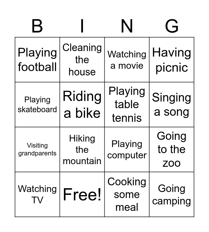 This bingo card has 16 words: Free!, Going to the zoo, Watching a movie, Playing football, Visiting grandparents, Cleaning the house, Playing computer, Cooking some meal, Playing skateboard, Riding a bike, Watching TV, Having picnic, Hiking the mountain, Singing a song, Playing table tennis and Going camping.