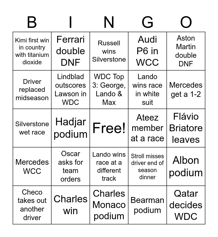 This bingo card has a free space and 24 words: Oscar asks for team orders, Charles win, WDC Top 3: George, Lando & Max, Checo takes out another driver, Aston Martin double DNF, Kimi first win in country with titanium dioxide, Driver replaced midseason, Ferrari double DNF, Ateez member at a race, Lando wins race at a different track, Lando wins race in white suit, Silverstone wet race, Stroll misses driver end of season dinner, Albon podium, Lindblad outscores Lawson in WDC, Bearman podium, Flávio Briatore leaves, Russell wins Silverstone, Mercedes get a 1-2, Hadjar podium, Qatar decides WDC, Mercedes WCC, Audi P6 in WCC and Charles Monaco podium.