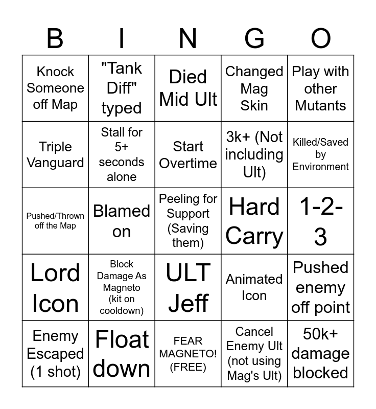 This bingo card has 25 words: Lord Icon, Float down, Peeling for Support (Saving them), Cancel Enemy Ult (not using Mag's Ult), Play with other Mutants, Knock Someone off Map, "Tank Diff" typed, Died Mid Ult, Hard Carry, Pushed enemy off point, Triple Vanguard, Stall for 5+ seconds alone, FEAR MAGNETO! (FREE), Animated Icon, Killed/Saved by Environment, Enemy Escaped (1 shot), Blamed on, Start Overtime, 3k+ (Not including Ult), 1-2-3, Pushed/Thrown off the Map, Block Damage As Magneto (kit on cooldown), ULT Jeff, Changed Mag Skin and 50k+ damage blocked.