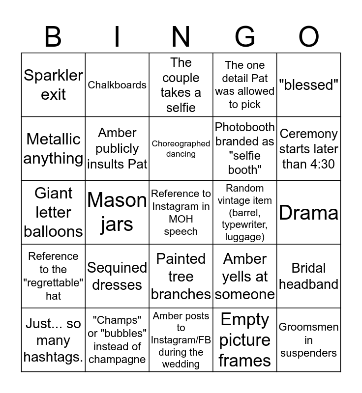 This bingo card has a free space and 24 words: Sequined dresses, "Champs" or "bubbles" instead of champagne, Choreographed dancing, Just... so many hashtags., "blessed", Sparkler exit, Metallic anything, Chalkboards, Random vintage item (barrel, typewriter, luggage), Painted tree branches, Photobooth branded as "selfie booth", Giant letter balloons, Amber yells at someone, Bridal headband, Amber publicly insults Pat, Empty picture frames, Drama, The couple takes a selfie, Ceremony starts later than 4:30, Mason jars, Groomsmen in suspenders, Reference to the "regrettable" hat, The one detail Pat was allowed to pick and Amber posts to Instagram/FB during the wedding.