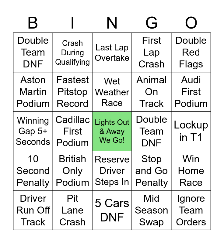 This bingo card has a free space and 24 words: British Only Podium, Pit Lane Crash, Wet Weather Race, Driver Run Off Track, Double Red Flags, Double Team DNF, Aston Martin Podium, Crash During Qualifying, Double Team DNF, Reserve Driver Steps In, Animal On Track, Winning Gap 5+ Seconds, Stop and Go Penalty, Win Home Race, Fastest Pitstop Record, Mid Season Swap, Lockup in T1, Last Lap Overtake, Audi First Podium, Cadillac First Podium, Ignore Team Orders, 10 Second Penalty, First Lap Crash and 5 Cars DNF.