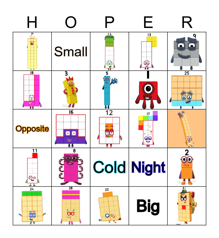 This bingo card has 30 images and 8 words: Hot, Cold, Big, Small, Day, Night, Opposite and Opposites.