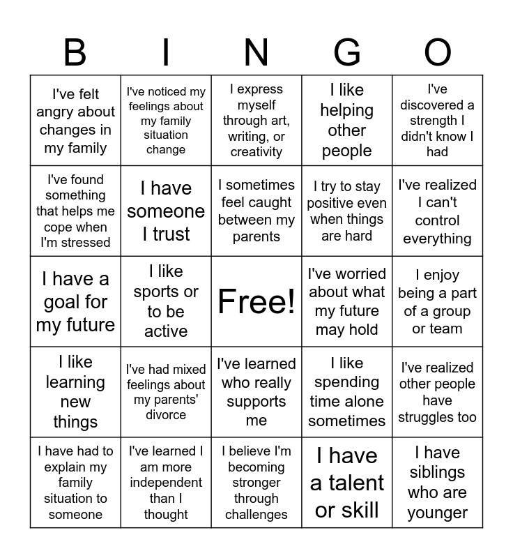This bingo card has a free space and 24 words: I've had mixed feelings about my parents' divorce, I've learned I am more independent than I thought, I sometimes feel caught between my parents, I have had to explain my family situation to someone, I've discovered a strength I didn't know I had, I've felt angry about changes in my family, I've found something that helps me cope when I'm stressed, I've noticed my feelings about my family situation change, I've worried about what my future may hold, I've learned who really supports me, I try to stay positive even when things are hard, I have a goal for my future, I like spending time alone sometimes, I've realized other people have struggles too, I have someone I trust, I have a talent or skill, I enjoy being a part of a group or team, I express myself through art, writing, or creativity, I've realized I can't control everything, I like sports or to be active, I have siblings who are younger, I like learning new things, I like helping other people and I believe I'm becoming stronger through challenges.