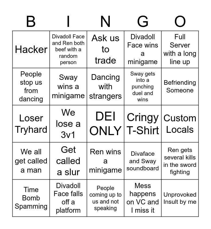 This bingo card has a free space and 24 words: Get called a slur, Divadoll Face falls off a platform, Dancing with strangers, Time Bomb Spamming, Full Server with a long line up, Hacker, People stop us from dancing, Divadoll Face and Ren both beef with a random person, Cringy T-Shirt, Ren wins a minigame, Sway gets into a punching duel and wins, Loser Tryhard, Divaface and Sway soundboard, Ren gets several kills in the sword fighting, Sway wins a minigame, Mess happens on VC and I miss it, Custom Locals, Ask us to trade, Befriending Someone, We lose a 3v1, Unprovoked Insult by me, We all get called a man, Divadoll Face wins a minigame and People coming up to us and not speaking.