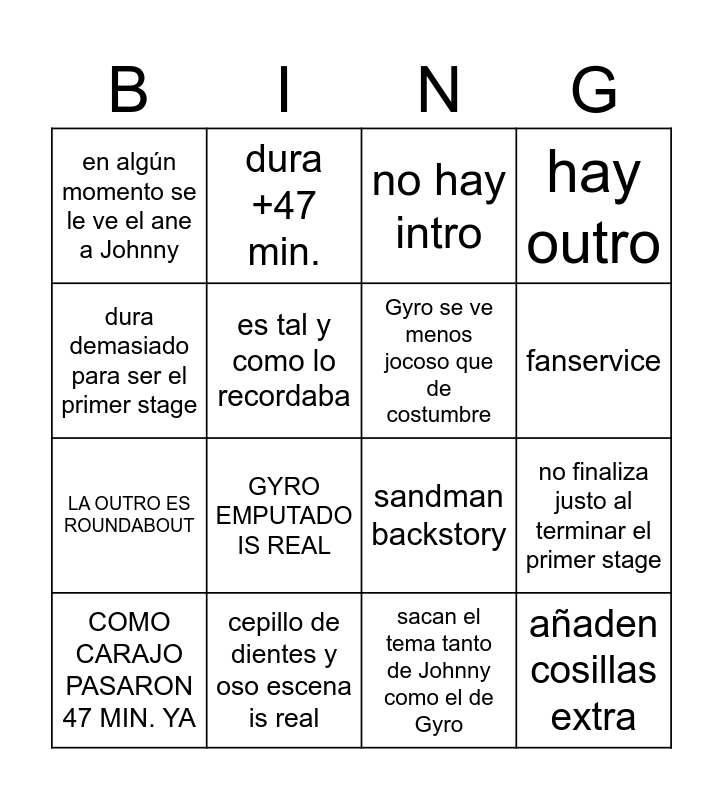 This bingo card has 16 words: cepillo de dientes y oso escena is real, no finaliza justo al terminar el primer stage, no hay intro, en algún momento se le ve el ane a Johnny, LA OUTRO ES ROUNDABOUT, dura +47 min., sandman backstory, sacan el tema tanto de Johnny como el de Gyro, dura demasiado para ser el primer stage, es tal y como lo recordaba, COMO CARAJO PASARON 47 MIN. YA, hay outro, GYRO EMPUTADO IS REAL, fanservice, Gyro se ve menos jocoso que de costumbre and añaden cosillas extra.