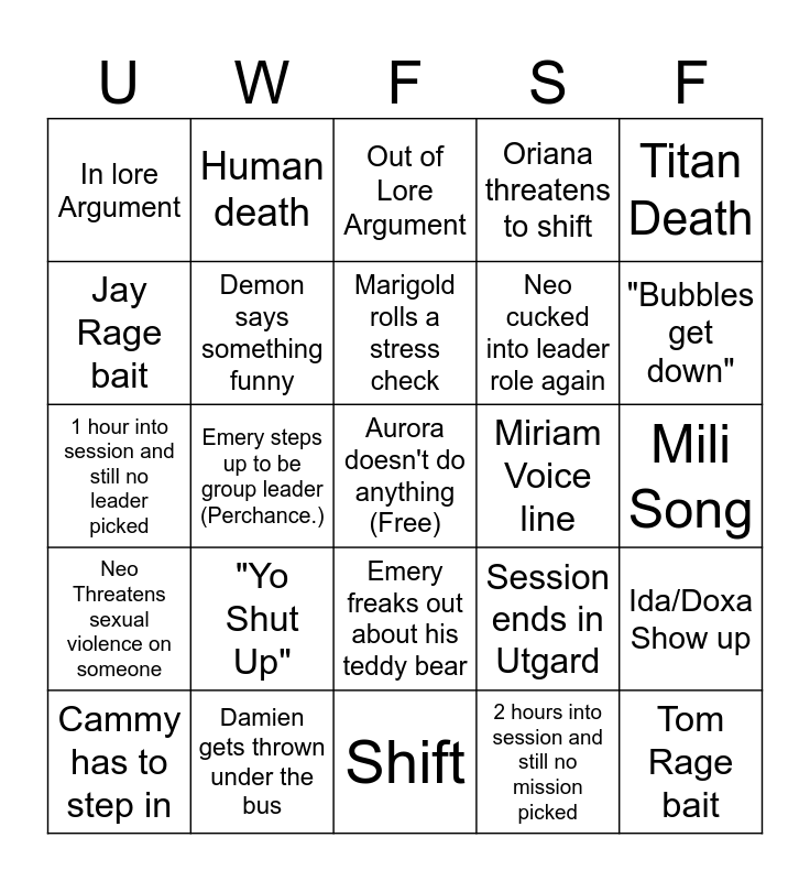 This bingo card has a free space and 24 words: "Yo Shut Up", Damien gets thrown under the bus, Marigold rolls a stress check, Cammy has to step in, Titan Death, In lore Argument, Jay Rage bait, Human death, Miriam Voice line, Emery freaks out about his teddy bear, Neo cucked into leader role again, 1 hour into session and still no leader picked, Session ends in Utgard, Ida/Doxa Show up, Demon says something funny, 2 hours into session and still no mission picked, Mili Song, Out of Lore Argument, "Bubbles get down", Emery steps up to be group leader (Perchance.), Tom Rage bait, Neo Threatens sexual violence on someone, Oriana threatens to shift and Shift.
